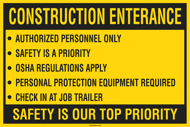 This Construction Entrance sign outlines required safety rules for entering an active job site. It clearly communicates access restrictions, PPE requirements, and OSHA regulations to workers and visitors. Commonly posted at construction site entrances, job trailers, and controlled access points to support site safety and compliance.