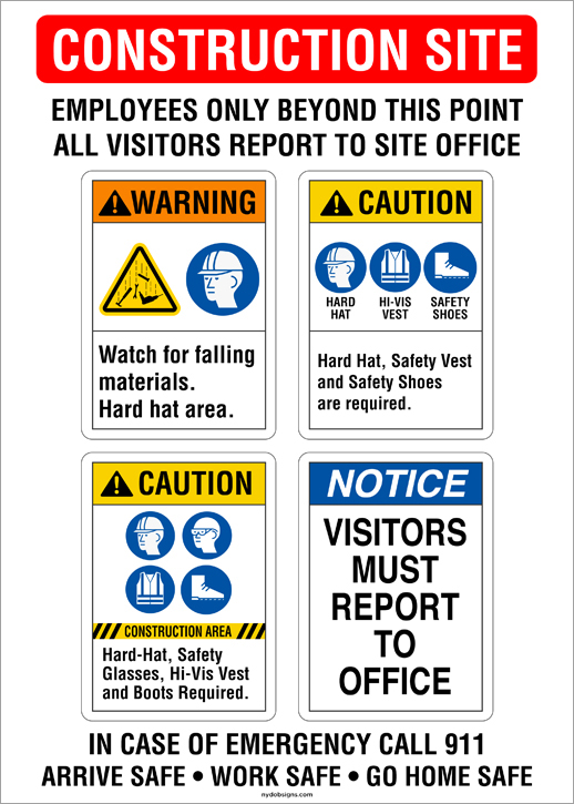 This Construction Site safety sign informs workers and visitors of access restrictions and required safety equipment beyond the job site entrance. It highlights PPE requirements and directs visitors to report to the site office before entry. Commonly used at active construction zones to promote OSHA compliance and maintain safe site operations.